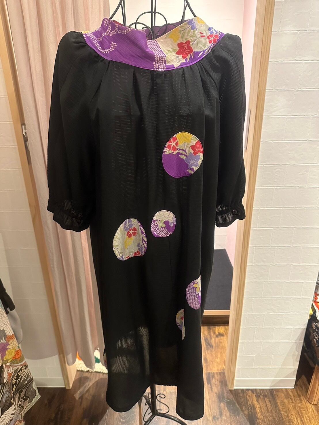 ・絽と振袖をリメイクした、長袖のワンピースです。生地の持つ軽やかさと上品さが、どんなシーンでも映える特別な一枚。