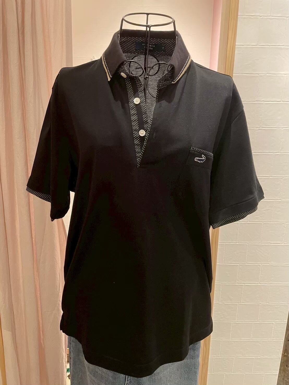 ・襟、袖、胸元ボタン部分にドット柄のアクセントが施されています