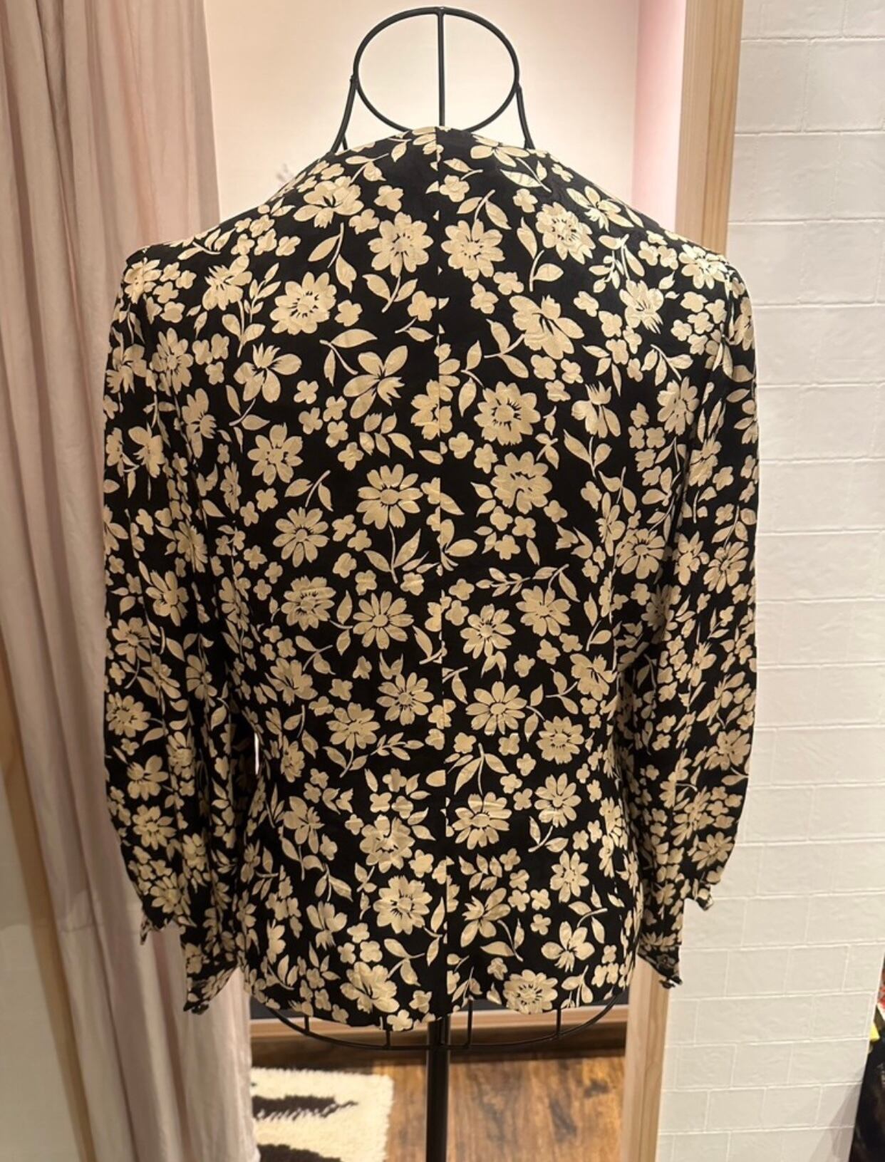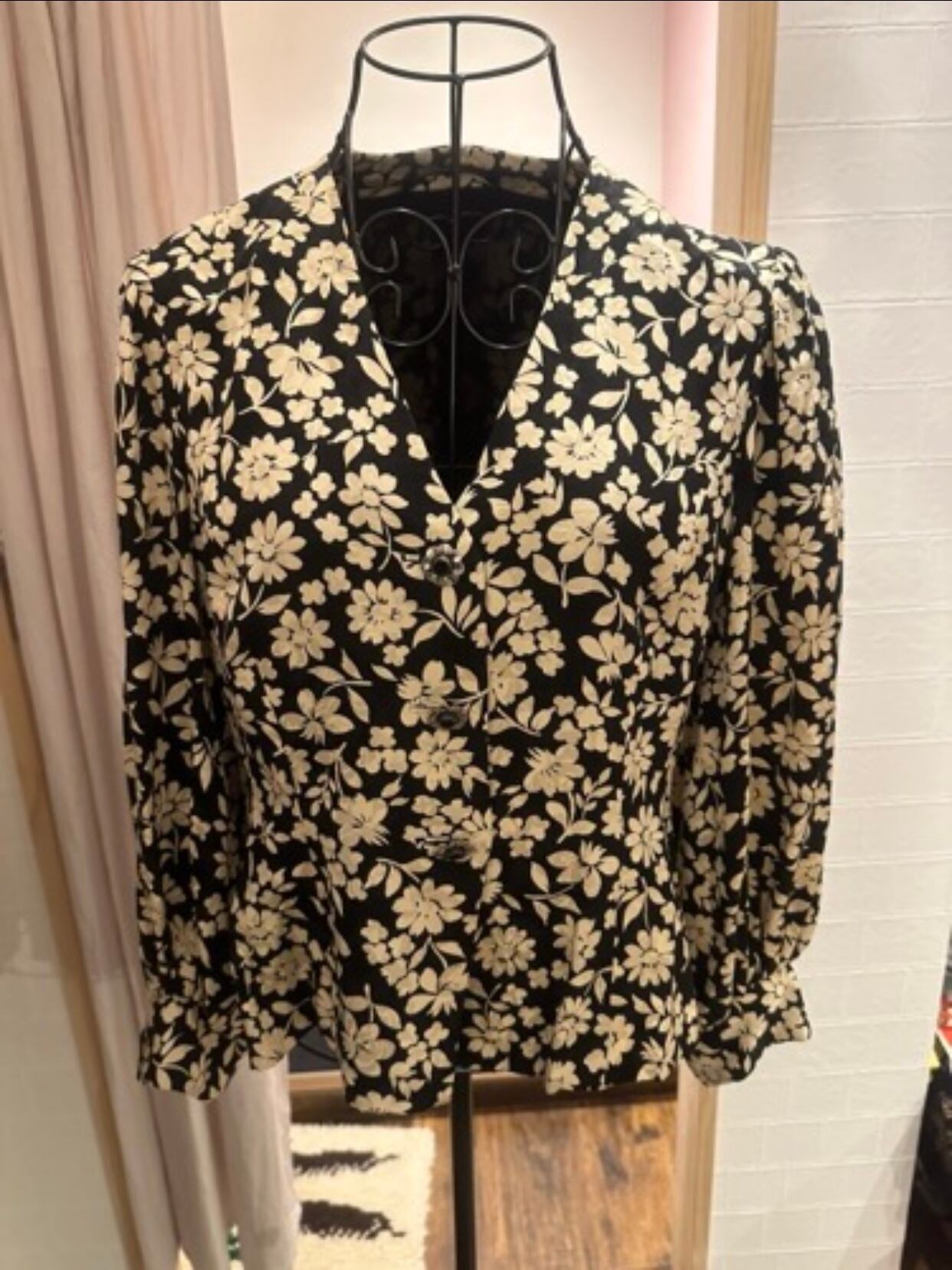 ・特徴:華やかな花柄のジャケットは、ボタンにも同じ花柄が施されており、全体のデザインが統一感ある仕上がり。裏地付きで、袖部分にはギャザーが入っているため、動きやすさと可愛さを両立させています。ツルツルした感触が特徴で、ダンスシーンや普段使いにも最適な一着です。