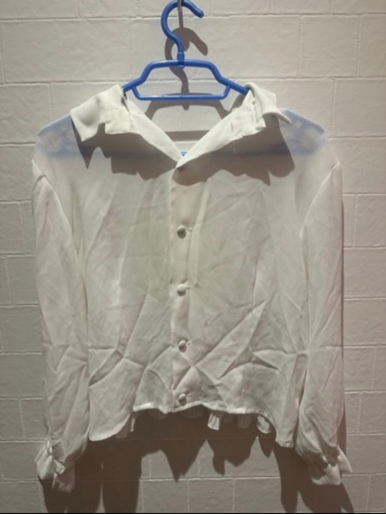 ・特徴:華やかな印象を与えるホワイトのブラウスです。首周りに施されたボタンとフリル袖が特徴。