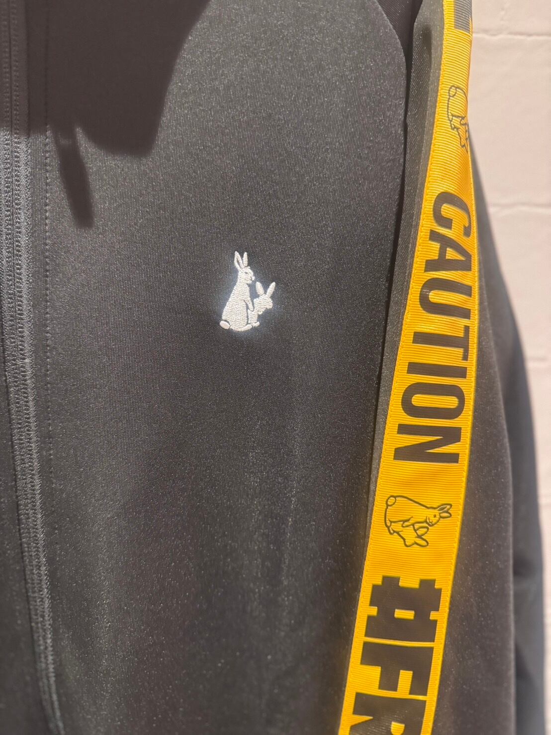 イエローラインがアクセントになった、スポーティーなジャージ素材のジップアップとパンツ。